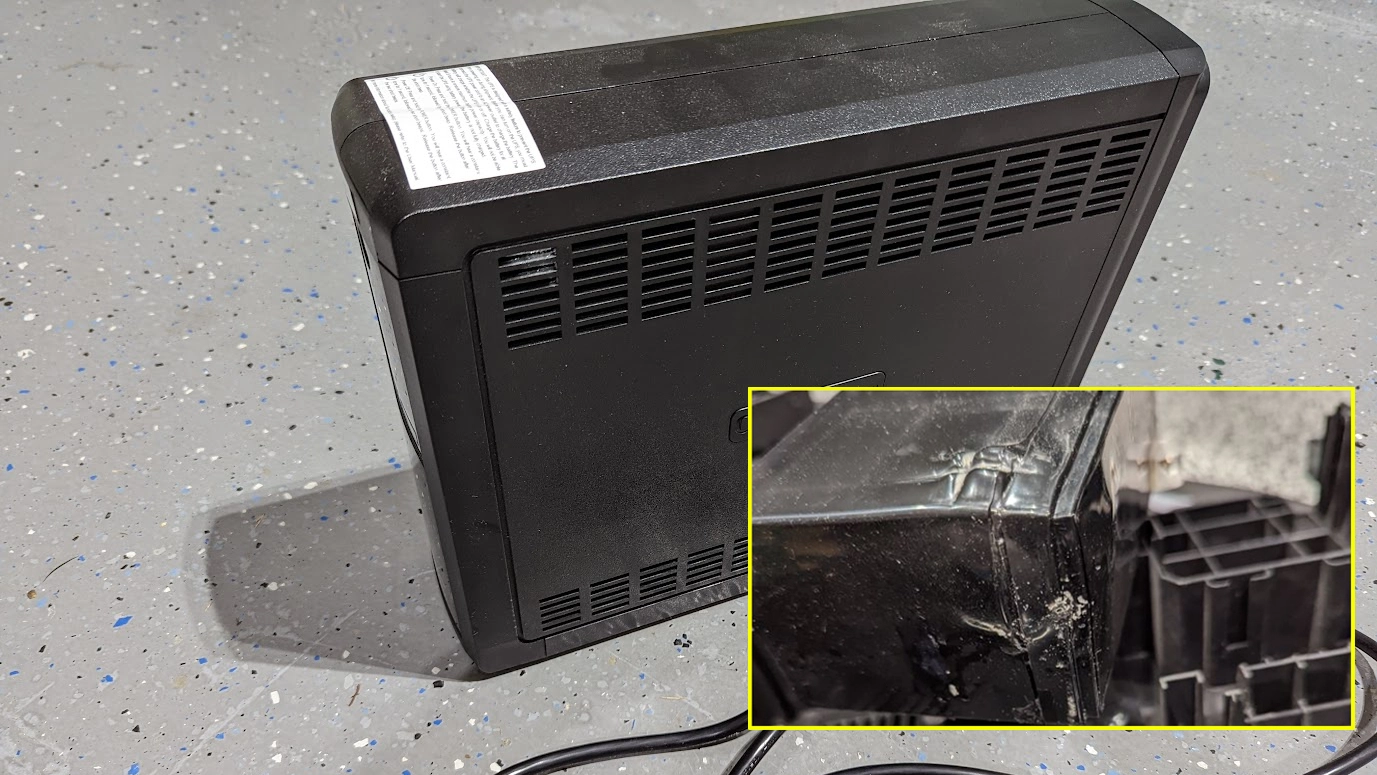 Mit sent us a slew of pictures of his fried CP1500AVRLCD UPS and has also shared a video of smoke still coming from the unit’s vents. He told us that the UPS had been connected to a low-powered PC (100W under full load), a Netgear GS108E Ethernet switch, a Fios Quantum Gateway router, a Philips Hue Bridge and an Arlo Smart Hub. He noted that, during its four-year lifespan, the CP1500AVRLCD had successfully stayed on through multiple power outages of 25 to 35 minutes.