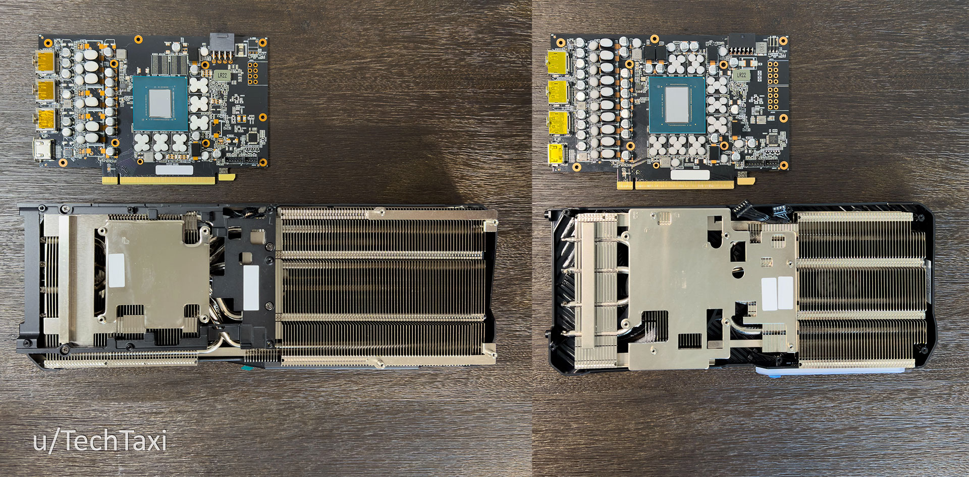 TechTaxi’s modified dual-slot dual-fan GeForce RTX 4080 design mates the Gainward 4070 Ghost OC cooling shroud with the Gainward 4080 Phoenix GS PCB, with a few modifications to fit. Specifically, a few VRM clearance distances weren’t quite right when the cooler was swapped over, so the smaller cooler had to be milled down in several strategic places (over some VRMs).