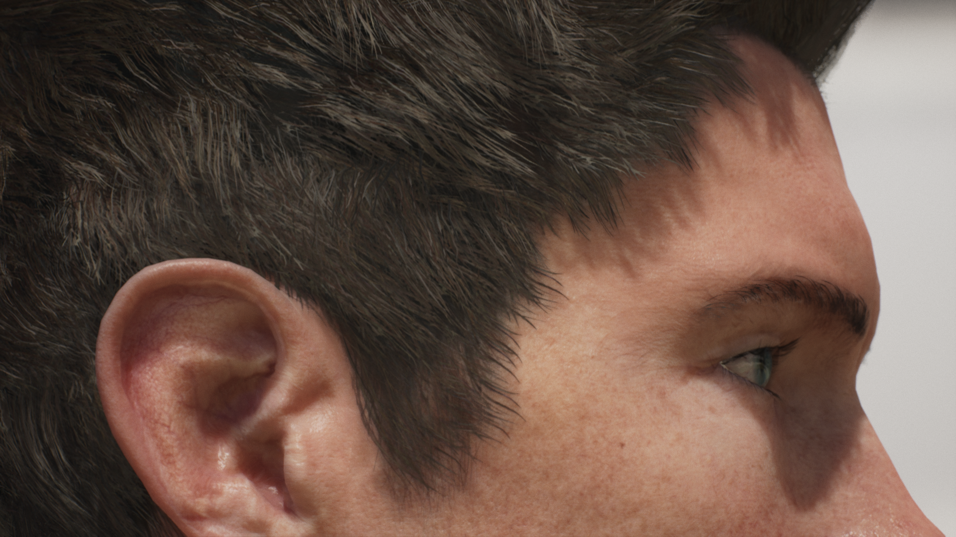 The model features textures created from scans taken with OTOY’s facial scanning technology. The character’s face is detailed such that you can make out individual pores and veins below the surface of its (his?) skin. You can also see the blood vessels in the character’s eyes.