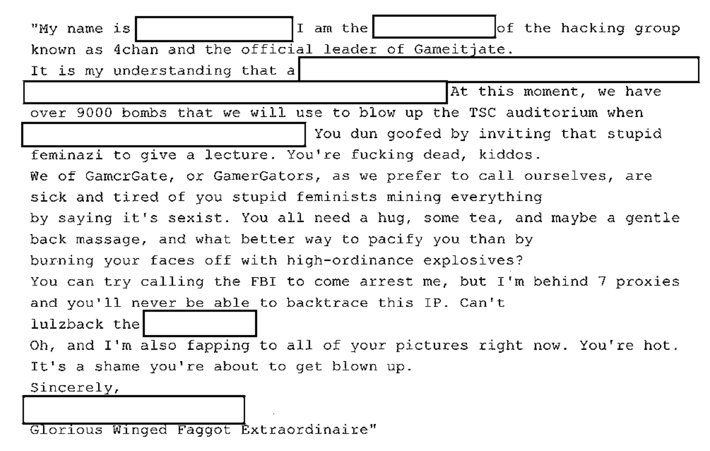 They were, however, outspoken about what they perceived as misogyny in video games. It appears that several GamerGators were not fond of this, as shown by this emailed bomb threat against the Taggart Student Center auditorium at Utah State University, where Sarkeesian was invited to speak: