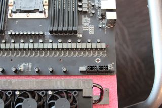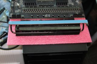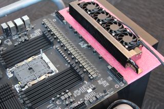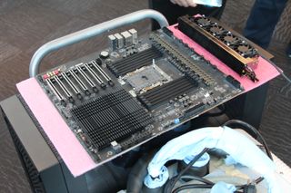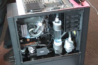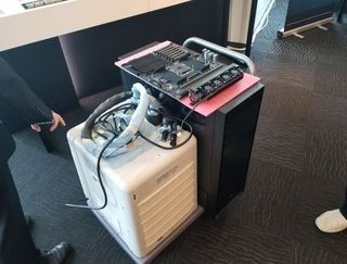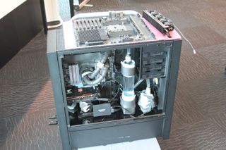 We assume Intel placed the chiller in the case underneath the system, so it's possible the company had to add at least some sound-reducing material inside the box. It's also possible that the presenters' unidirectional microphones were good enough to keep the sound of the chiller from coming out over the speaker system, but we think there was probably some form of soundproofing involved.