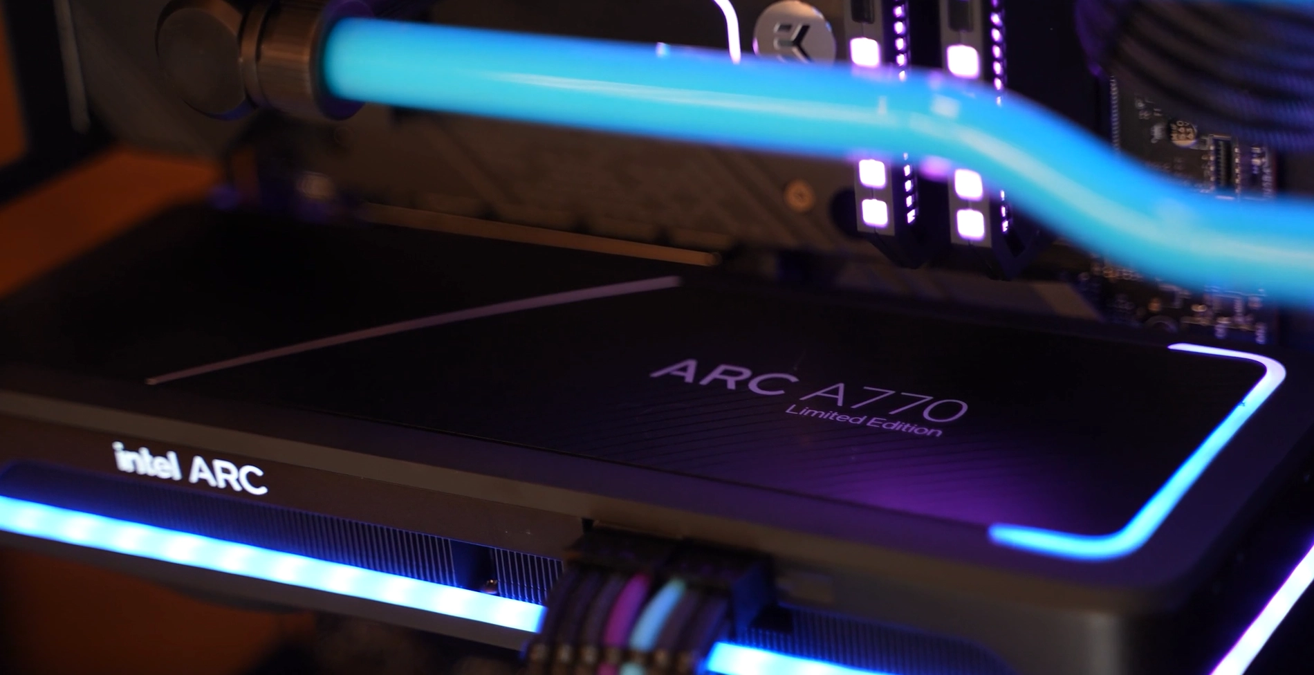 All three creations - signed by LiquidHous, Blue Horse, and PC Werkz - integrate Intel's Arc identity within tones of blue and violet. The three systems are beautiful in their own way, making good use of liquid cooling installation to enhance the cards' clean, industrial design.