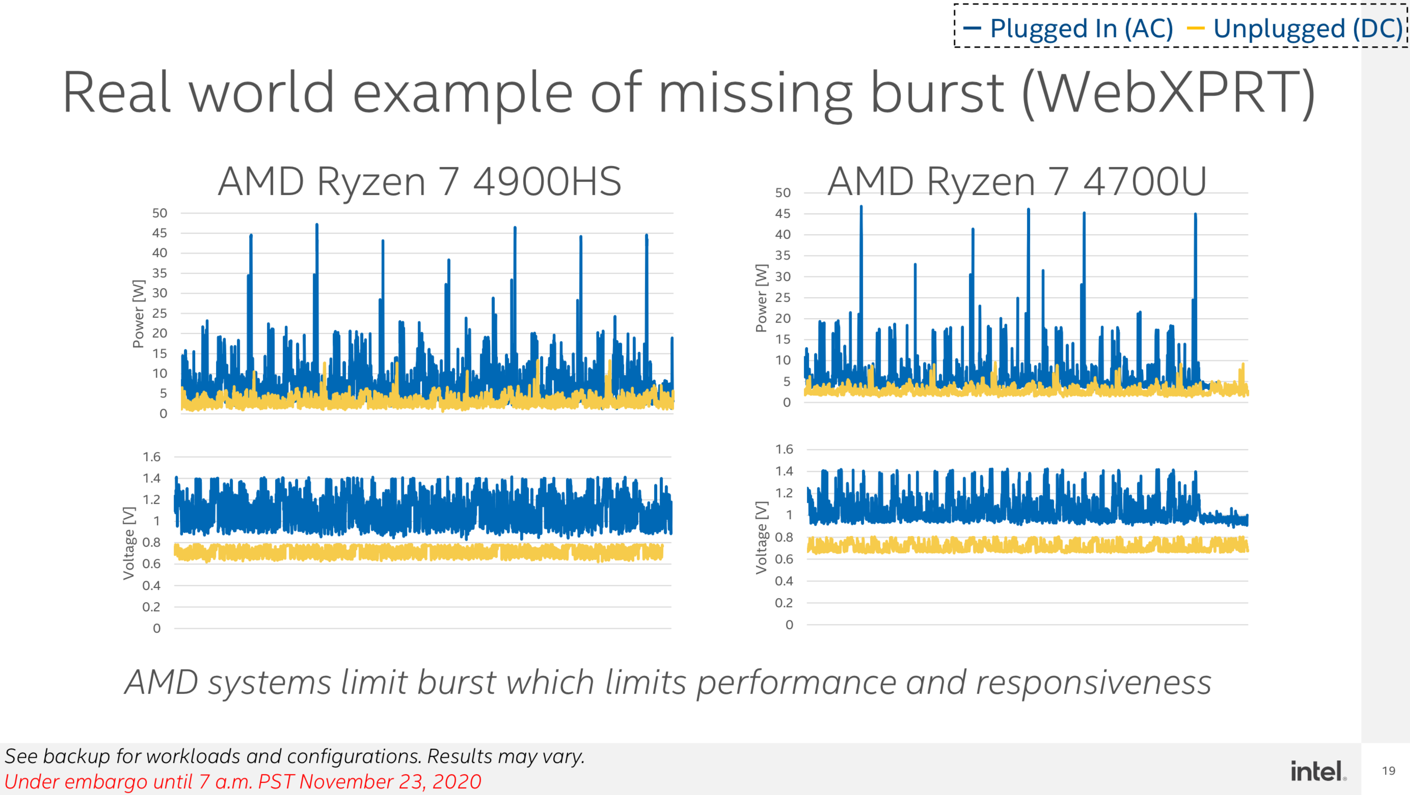 The reasoning, Intel suggests, is due to power and voltage. In an in-house "microbenchmark," the results showed AMD's Ryzen 7 4900HS and Ryzen 7 4700U delaying burst and responsiveness by up to 10 seconds. Notably, Intel didn't include its own chips in these tests. Intel used WebXPRT to show the systems limiting burst performance.