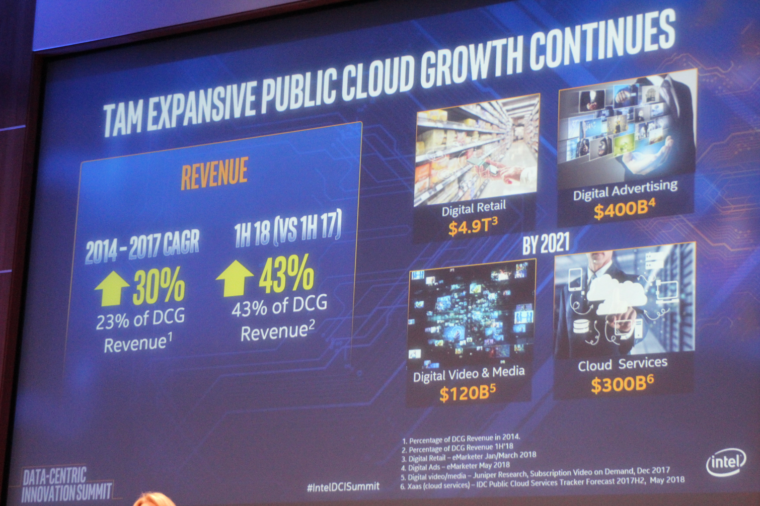 Skillern feels the cloud is still a growing field, even after a decade of development. "The cloud is the foundation of the digital transformation." All of these things translate to big revenue for Intel. The impressive revenue growth in this area is accelerating. This growth is fueled by the different segments listed on the right side of the slide.