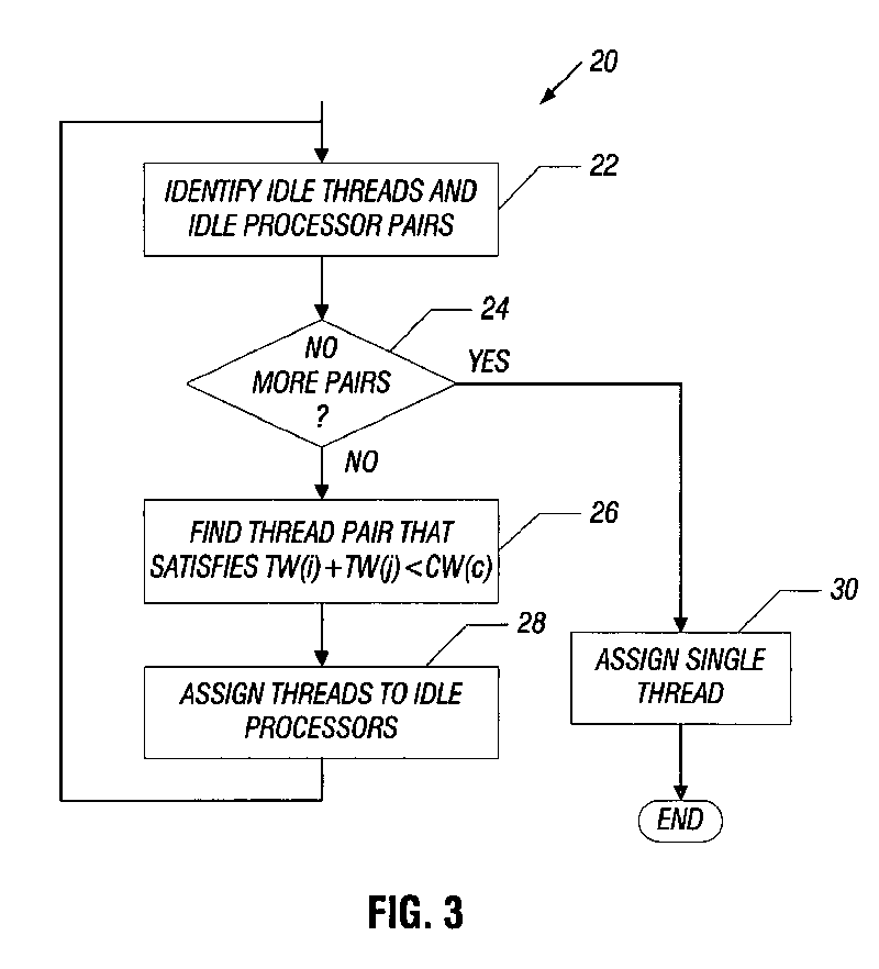Also claimed are instructions that provide information on whether the bandwidth utilization exceeds a threshold of 15 percent, as well as a capability to store "the coupling degree matrix by rating two threads in terms of the total amount of accesses to cache lines shared between two threads," as well as a "scheduler to determine the coupling degree matrix by rating the threads in terms of the total amount of accesses to cache lines."