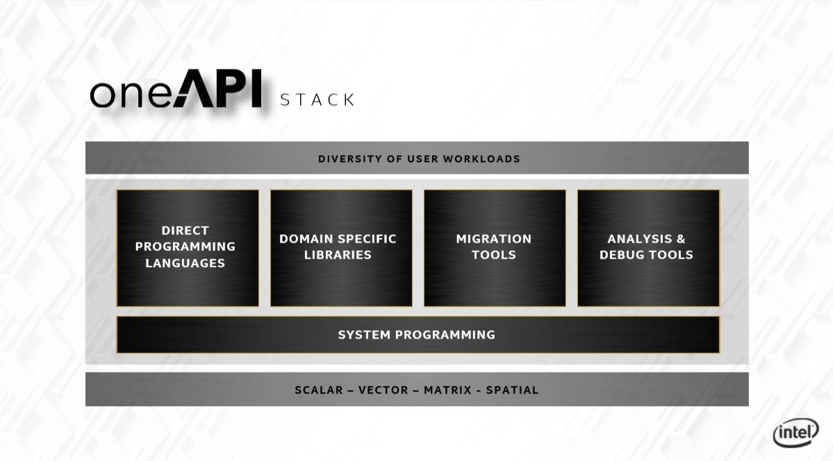 oneAPI is based on industry standards and open specifications, and consists of both the industry initiative and an Intel implementation of oneAPI. The industry initiative – open to all hardware vendors – specifies both a direct programming language, Data Parallel C++ based on C++ and the SYCL cross-platform abstraction layer, as well as API-based programming for accelerating domain-focused functions. Many parts of it are open source. For example, software developer Codeplay has already announced it is working on Nvidia GPU support for oneAPI.