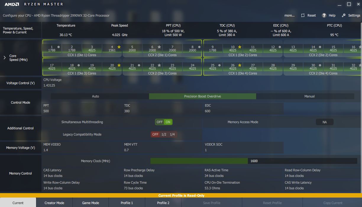 Like AMD’s other Zen/Zen+ processors, the Threadripper 2990WX features the company’s Precision Boost Overdrive (PBO) technology, which dynamically adjusts the CPUs parameters to match the current workload and power delivery environment. In our experience, it does a better job at maintaining a good balance of higher single- and multi-core boost frequencies than manually overclocking. Think of it as an automated overclocking feature that will extract the most performance possible from the silicon given the capabilities of your motherboard, cooler and power supply.