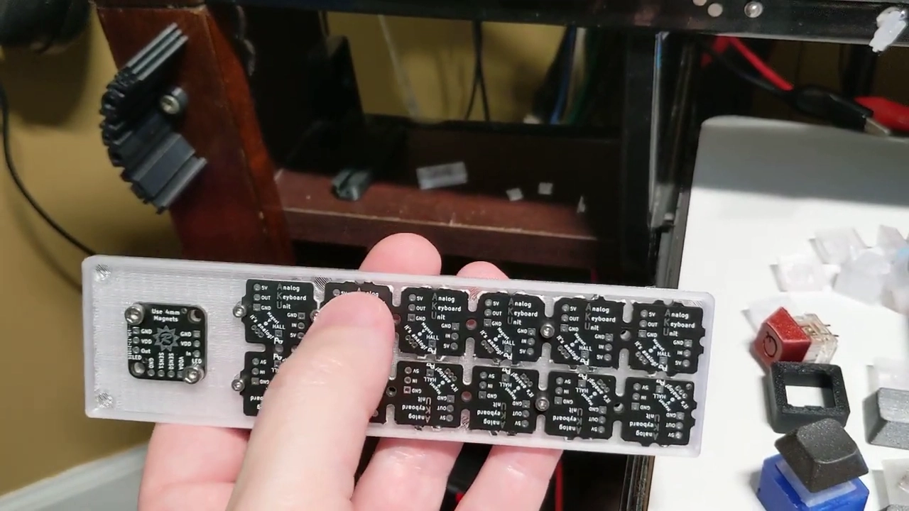 Tactility comes from varying the width of the plastic barrier between the attracting magnets - the thinner it is, the more they stick to each other, and the harder you need to press to separate them. That variable thickness, measured in fractions of a millimetre, exposes another truth about these new switches: you have to make them yourself, and they won’t fit many mechanical keyboards. The product of hacker Riskable’s fearsome imagination, they fit into Analog Keyboard Units he also created, and are 3D printed, meaning there’s lots of space for customization along the way.
