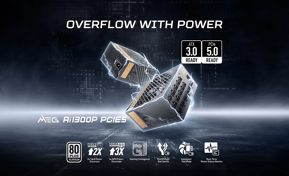 MSI has introduced the world's first fully compliant ATX 3.0 power supply: the MEG Ai1300P PCIE5. This unit is designed for power-hungry next-gen GPUs, and can withstand 2,600W power spikes.