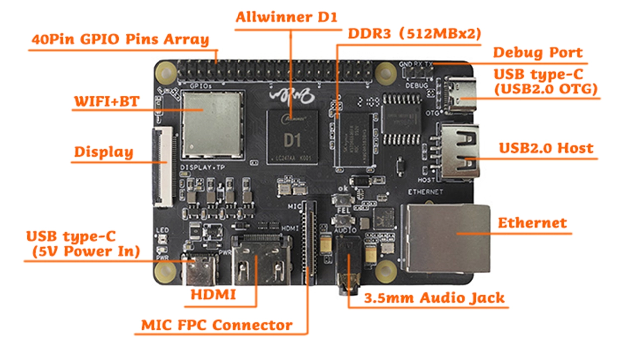 Buyers get a single-core Allwinner D1 64-bit RISC-V processor running at 1GHz, backed by 1GB of DDR3 RAM and 256MB of flash storage. The 40 pin GPIO looks to be Raspberry Pi compatible, but we would bet against being able to use HATs and other add-ons with it. Allwinner’s favoured OS is Tina, a fork of OpenWrt, itself a Linux project targeting embedded devices such as routers. It’s been around since 2004 and is optimized to fit in tiny spaces, generally being configured through the CLI. Debian 11 with a lightweight desktop environment is also available, while Fedora, Gentoo, and Ubuntu are also being worked on.