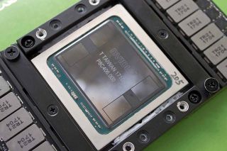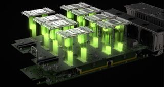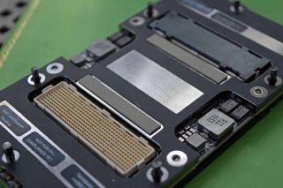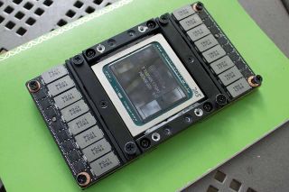 The Volta die resides on a block of steel, so the GV100 has quite a bit of heft to it. Nvidia equipped the bottom of the GV100 with two mezzanine connectors. One connector primarily serves typical PCIe traffic, and the other is dedicated to NVLink connections. The GV100 modules are secured to custom boards (Nvidia offers its HGX reference board) via eight fasteners, and the boards reside inside server chassis of varying heights.