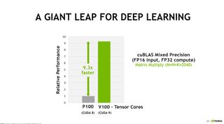 Nvidia claims impressive performance advantages over its previous-generation P100. Highlights include a 12x boost to training and a 6x boost for inferencing. Performance is fed, in part, by faster HBM2, L2, and L1 caches. Meanwhile, NVLink 2’s expanded bandwidth nearly doubles inter-GPU throughput.