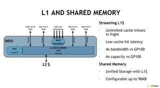 The four sub-cores send instructions into the MIO scheduler. The 128KB L1 data cache provides 128 bytes of bandwidth per clock. Each sub-core has a 64 byte-per-clock connection to the L1 data cache. Nvidia noted that it designed the cache subsystem for superior data streaming performance; it offers four times the bandwidth and capacity compared to the GP100.