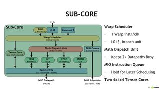 Each SM sub-core has its own L0 instruction cache and a dedicated branch unit. The warp scheduler feeds the math dispatch unit, sends MIO instructions to the MIO instruction queue for later scheduling, and feeds the two 4x4x4 Tensor cores (which are used specifically for deep learning).