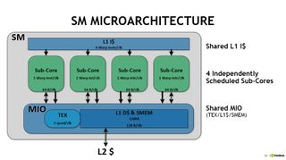 80 SMs, wielding a total of 5,120 CUDA cores and 640 Tensor cores, populate the die. Improvements include doubled warp schedulers, a large L1 instruction cache, and tensor acceleration. The shared L1 instruction cache feeds one warp instruction per clock to the independently scheduled sub-cores. Each sub-core processes one warp instruction per clock and feeds into the shared MIO unit. The MIO unit houses texture, shared L1 data cache, and shared memory.