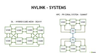 Nvidia’s NVLink accommodates several system topologies, such as the hybrid cube mesh in the DGX-1 for machine learning applications and the HPC-specific P9 Coral System’s unique design. These topologies minimize peer-to-peer latency and provide multipathing capabilities.