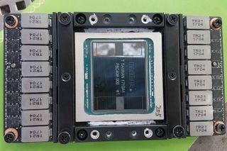 A hefty array of 16 inductors and voltage regulators line the edge of the card. The package pulls an average of 300W at a little below 1V, so over 300A flows into the die. Nvidia provides reference cooling designs, but most of its HPC customers opt for custom liquid cooling solutions, while many hyperscalers go with air cooling. The thermal solution attaches to the four silver-edged holes next to the die.