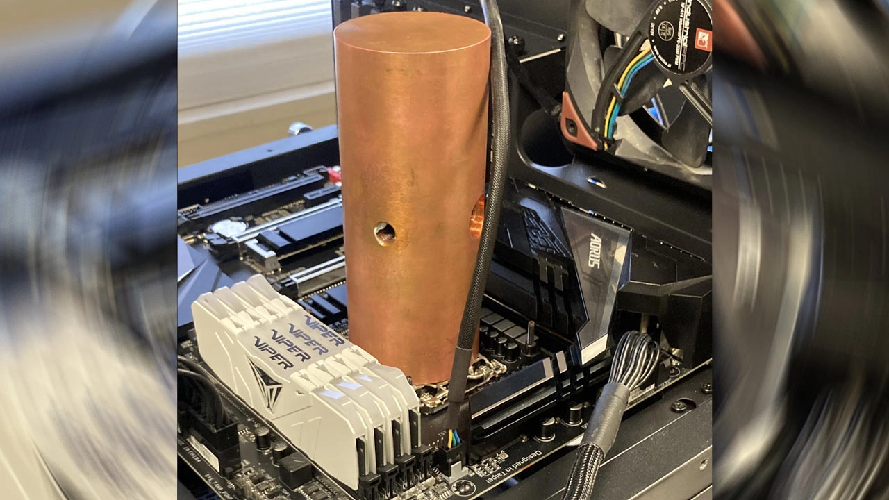 TDU shared a few facts and figures about their solid cylinder of copper cooling escapade, making this makeshift passive option sound almost practical. For the length of a short computing session, an Intel Core i9 (model undisclosed) was entirely passively cooled by the copper block. The photo below shows that the PC system was fully open-air during this testing process.
