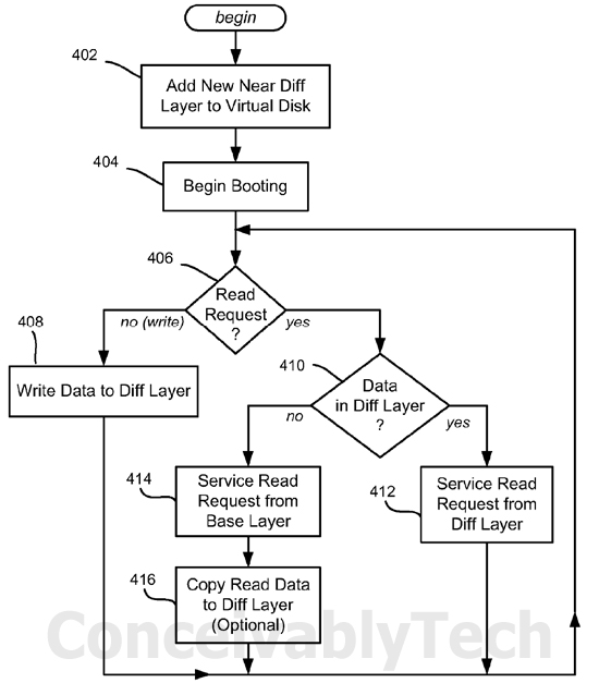 From the patent: “Described is a technology by which a virtual hard disk is maintained between a far (e.g., remote) backing store and a near (e.g., local) backing store, which among other advantages facilitates fast booting of a machine coupled to the virtual hard disk. Read requests are serviced from the near backing store (e.g., a differencing layer) when the data is available thereon, or from the far backing store (e.g., a base layer) when not. The near backing store may be configured with a cache layer that corresponds to the base layer and a write differencing layer that stores writes, or a single differencing layer may be used for both caching read data and for storing write data. A background copy operation may be used to fill the cache until the far backing store data is no longer needed.”
