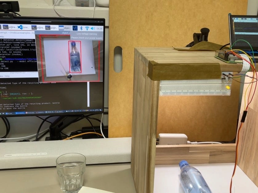 On top of the Raspberry Pi OS there's OpenCV, TensorFlow, and the OneM2M platform. Trash is fed through the wooden frame under the eye of the camera, and the image is analysed on the Pi using a model trained in TensorFlow , sorting it into categories that require different recycling treatment. Should the visual sorting fail, there's also a spectrometer to perform secondary sorting. An actuator then sorts the object into the right can.