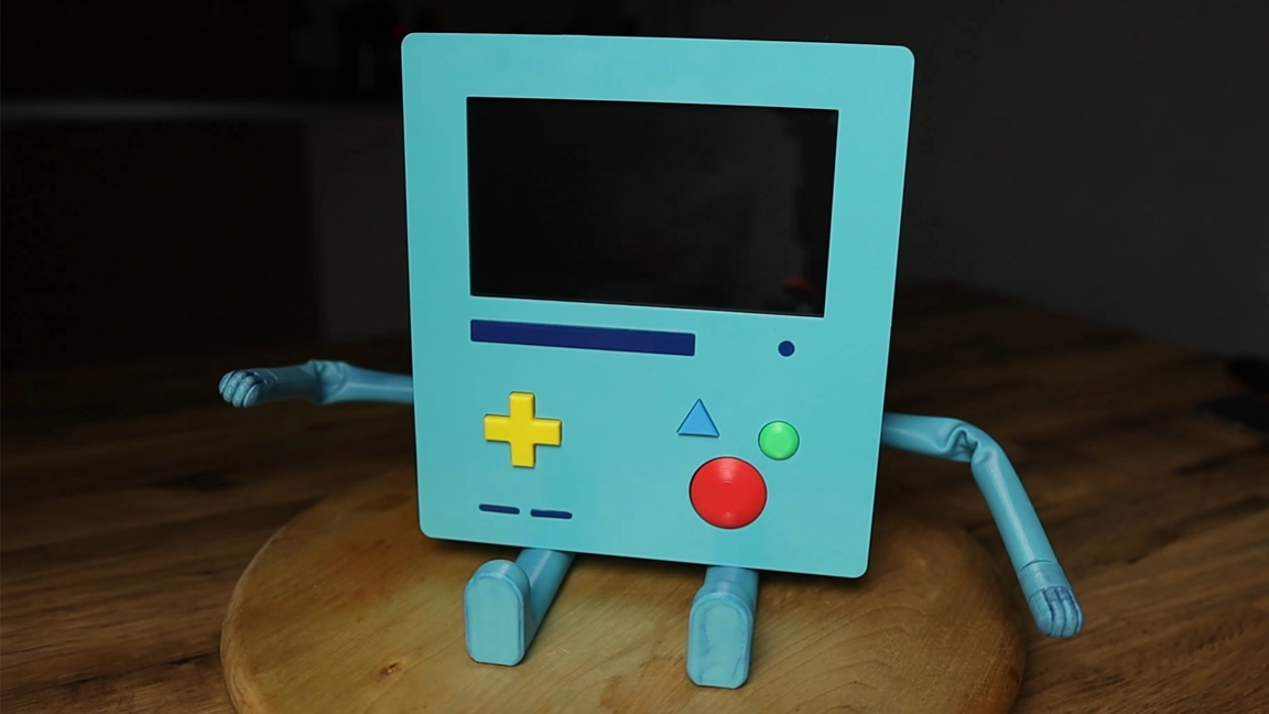 Inside BMO, you’ll find a Raspberry Pi with a dedicated screen where BMO’s face usually is. A speaker is mounted inside the body for audio output. A custom PCB was developed to make the front-facing buttons functional. These buttons look just like the originals found on BMO and are printed using PLA filament.