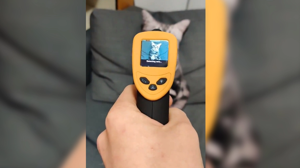 Don't worry, this cat-detecting gun is safe—shooting only images that are evaluated using machine learning to determine whether or not the user is, in fact, looking at a cat. The unit is housed inside of an old IR thermometer.