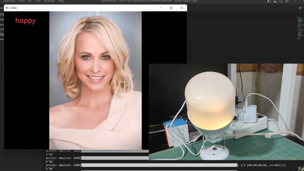 The processing starts on a separate PC running Microsoft VS Code and handles the AI processing using OpenCV and Deepface library. Sharifi uses a video slideshow with pictures of different emotions to demonstrate the project. The PC determines what emotion is likely being conveyed and then sends a command to the Pico to change the color of the light.