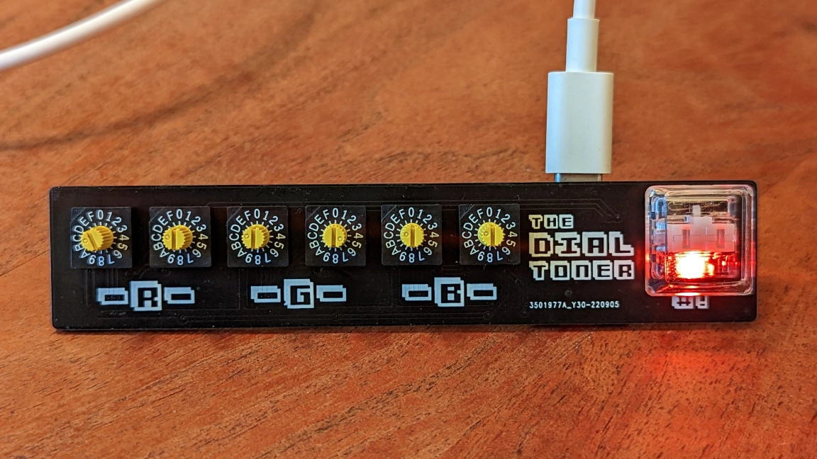 The way The Dial Toner works is simple and definitely fun to play around with. There are 6 clicky potentiometer knobs that can be twisted and turned to dial in a specific value (A - F and 0 - 9). You can use these knobs to dial in a preferred hexadecimal string that corresponds with a color. An LED, housed inside of a clear keycap shows the desired color. Pressing this key to register the color with the interface Dupont created.