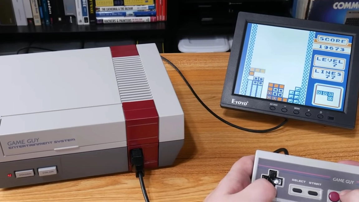 The system is housed inside of an old Nintendo Entertainment System (NES). It uses an original Game Boy along with an NES controller for input. There are two Picos inside: one dedicated to converting the video output to VGA and a second for interpreting input data from the NES controller.