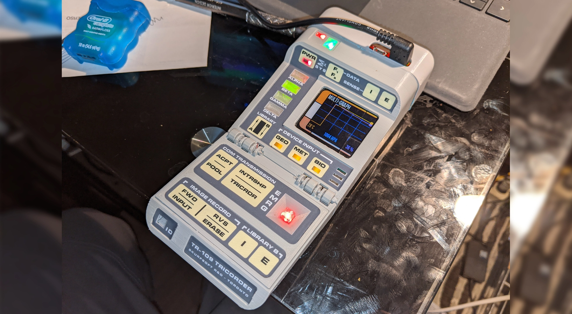 The project is officially dubbed TR-109 Picorder 2. The main goal was to create a self-contained Raspberry Pi "data acquisition platform" (essentially a machine with lots of sensors) that looks just like an old school tricorder.