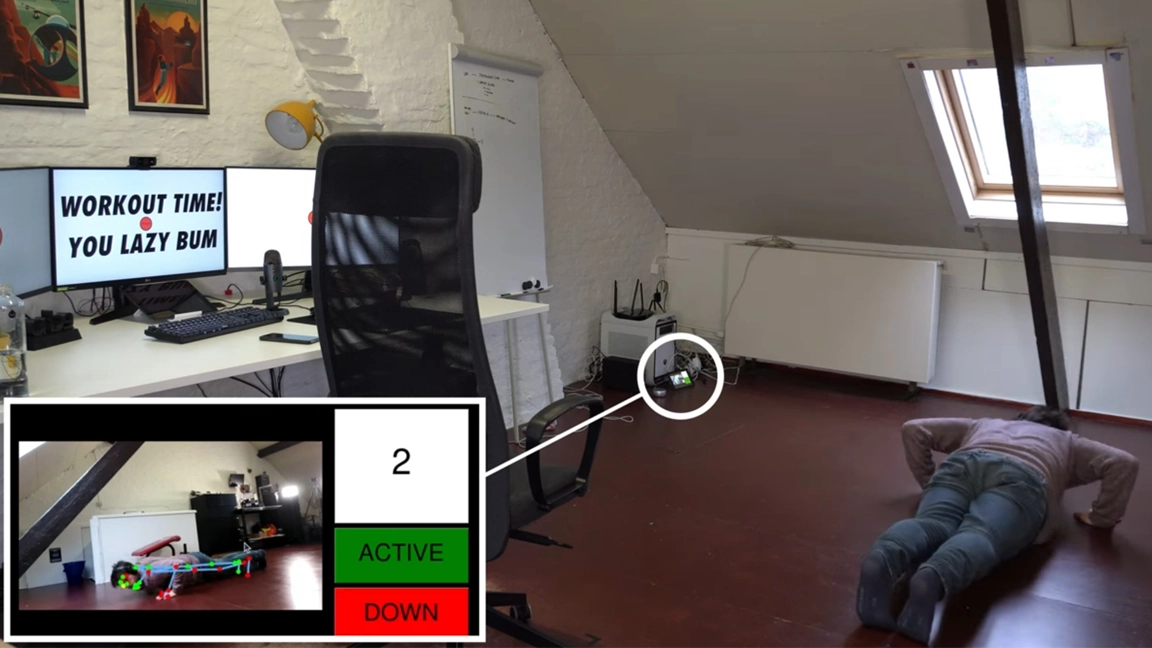 The Raspberry Pi push-up detection system runs independently from his PC and is positioned in a far corner of the room. Using a camera, it detects when Sonck has successfully completed the number of pushups necessary to log in to his machine before sending a command to allow access.