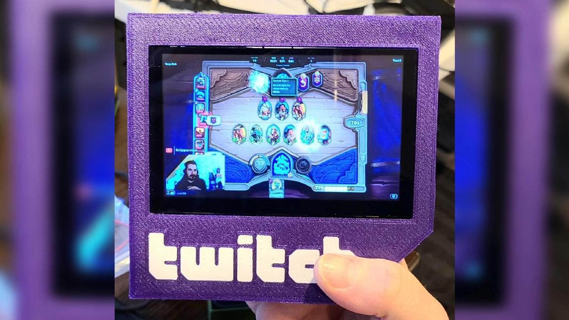 The hardware is housed inside a purple, 3D-printed shell resembling the twitch.tv logo. Bob configured the system to play in real-time at full volume when a stream begins. He describes it as a “twitch.tv TV, a twitch.tv TV made to look like twitch.tv that plays twitch.tv on its uh... monitor.”