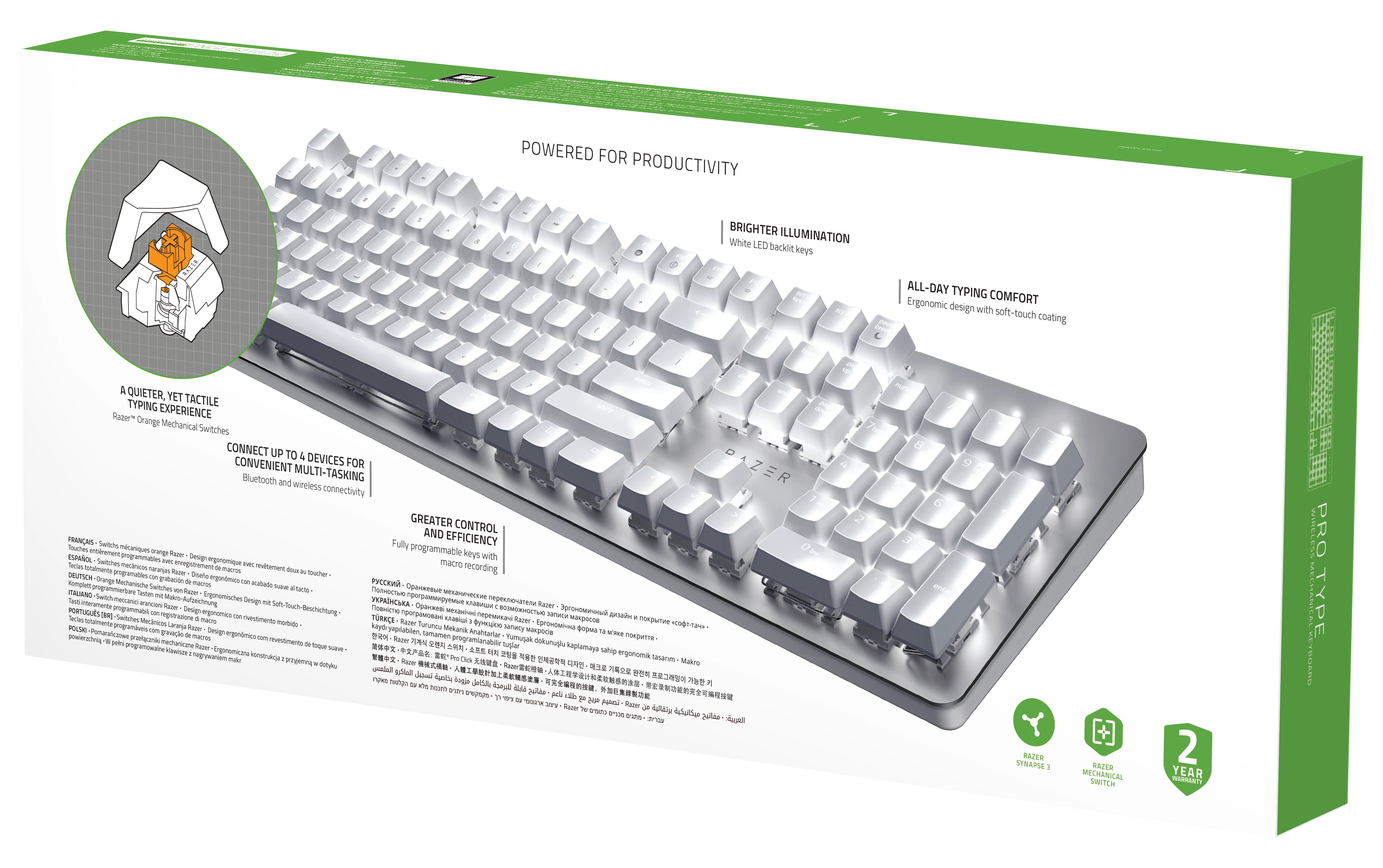 The Razer Pro Type, meanwhile, is a mechanical keyboard that shares the same aesthetic and goal as the Pro Click, but isn’t made in collaboration with Humanscale. This is a combination wired/wireless keyboard (it comes with a detachable braided USB-C cable) that uses Razer’s orange switches, which require 45 grams of force and have a 1.9mm actuation point and 4.0mm total travel distance. The goal here is on providing a comfortable experience that doesn’t require much force and leans towards a quieter sound profile. Like the Pro Click, the Pro Type can pair with up to 4 devices at once, though it also includes features pioneered by Razer’s gaming gear. This means it has fully programmable keys with macro recording and 10-key rollover anti-ghosting. The office-like aesthetics mean the only lighting here, though, are white LED backlights for each key. Battery life varies between 12 to 84 hours depending on your connectivity standard and whether you have the backlight on.