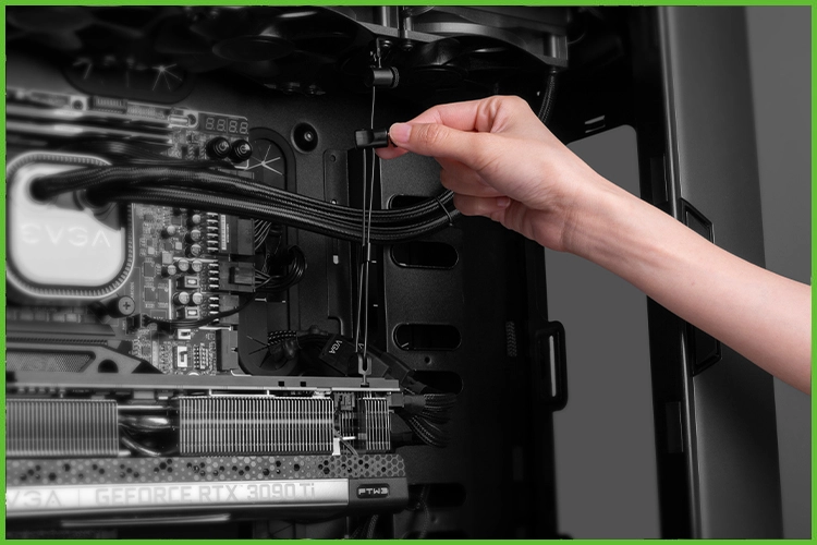 The anti-sag device is a large cable hooked up to a fan mount at the top of your case, which then hooks onto EVGA's RTX 3090 Ti SKUs from the card's backplate. The backplate features a custom mount just for this device.