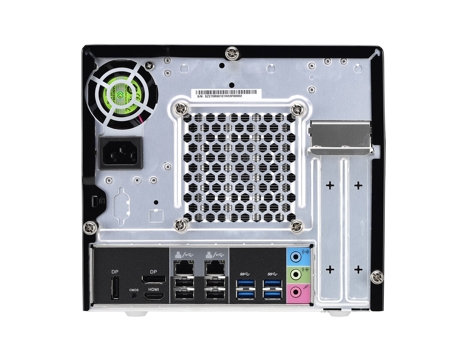 The device supports 6th and 7th generation 95W Intel processors (Skylake and Kaby Lake) with its Z270 chipset motherboard, with support for up to 64GB (4 x 16GB) DDR4-2400 memory. The SZ270R9 sports a unique CPU cooler, with four heat pipes making direct contact with the CPU and feeding to aluminum fins in the back of the device (away from the CPU mount) that dissipate the heat. For storage, you can equip the SZ270R9 with up to four 3.5” or 2.5” drives (SSD or HDD), two M.2 2280 Type-M devices, or an M.2 2230 Type-A drive.