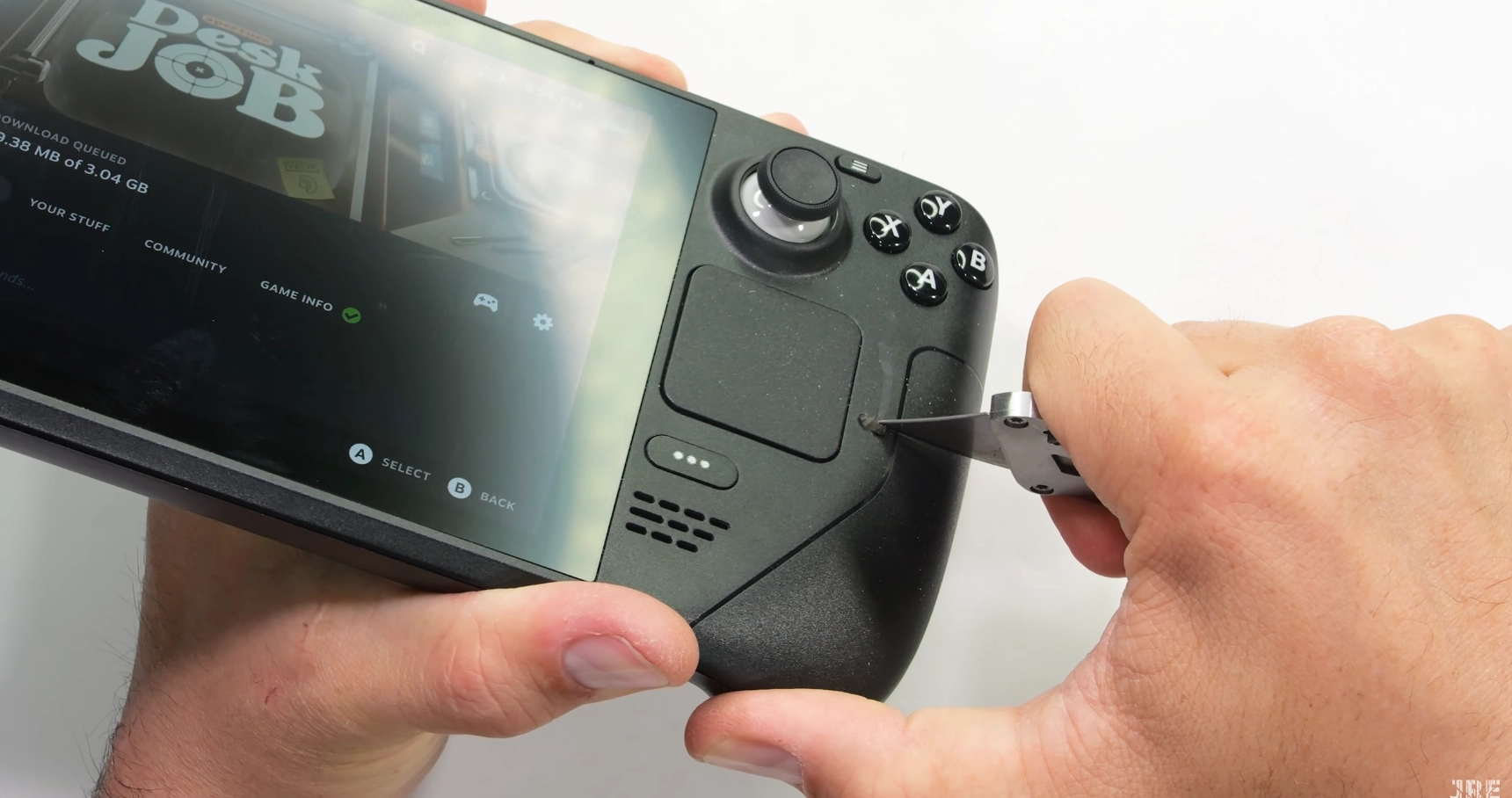 Article continues belowFortunately for the Steam Deck, the screen was the most sensitive component to Jerry's durability tests. Scratching the hard plastic shell of the Deck, along with its rubberized buttons and plastic buttons, showed no loss in functionality and only left ugly scratches to look at. In fact, the rubberized buttons themselves feature lettering that is embedded all the way through the button. So it will be impossible for gamers to rub the lettering off the buttons after years of use.
