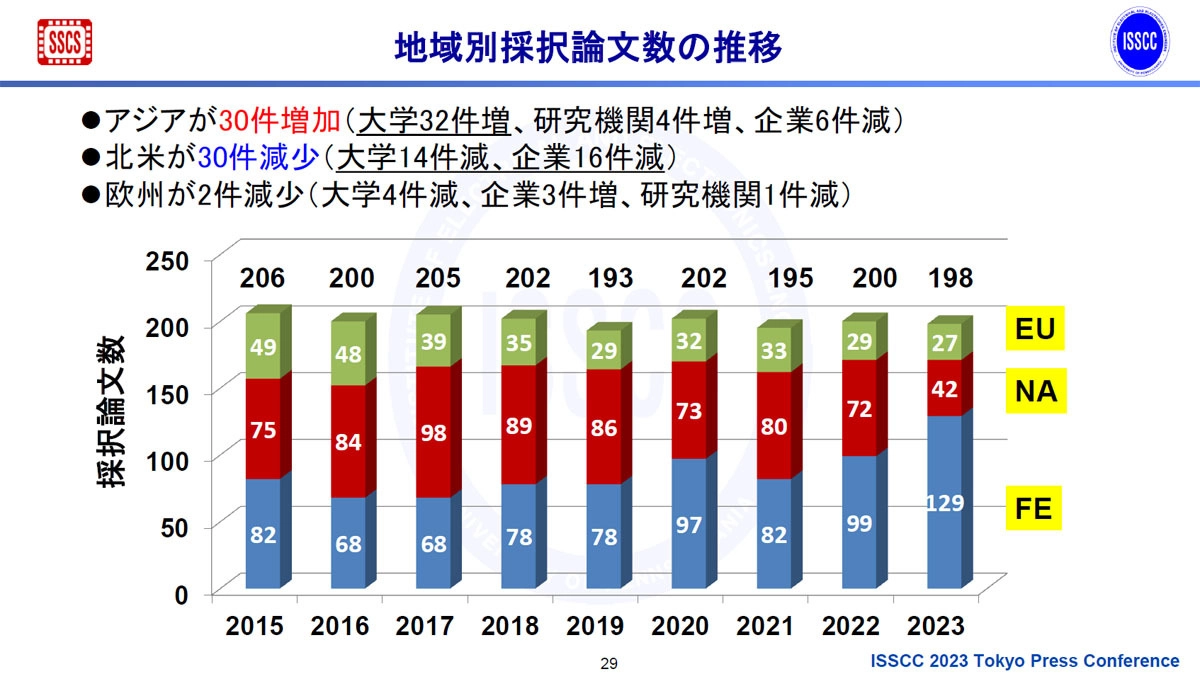 With 59 accepted papers from China against 42 out of North America, the U.S. can no longer claim supremacy in advanced chip research. Part of that reason stems from the fact that the U.S. submitted 30 fewer research papers for ISSCC 2023 than it did for the preceding edition, while China increased its number of submissions. In fact, at 129 accepted papers out of the 198 total, the entire Far East region, which comprises East and South East Asia, now has almost double the submitted (and accepted) papers compared to the EU and the U.S. combined (27 and 42, respectively).
