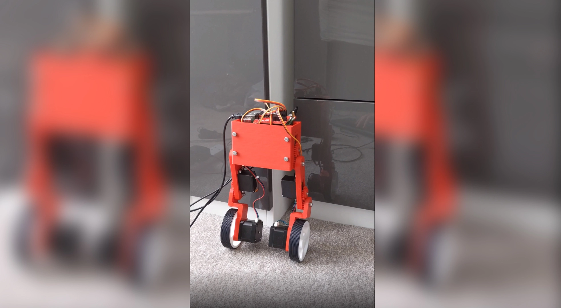 The wheels use two 38mm Nema 17 stepper motors, while each leg uses an MG996R Servo. These components allow for the control necessary to maintain balance.