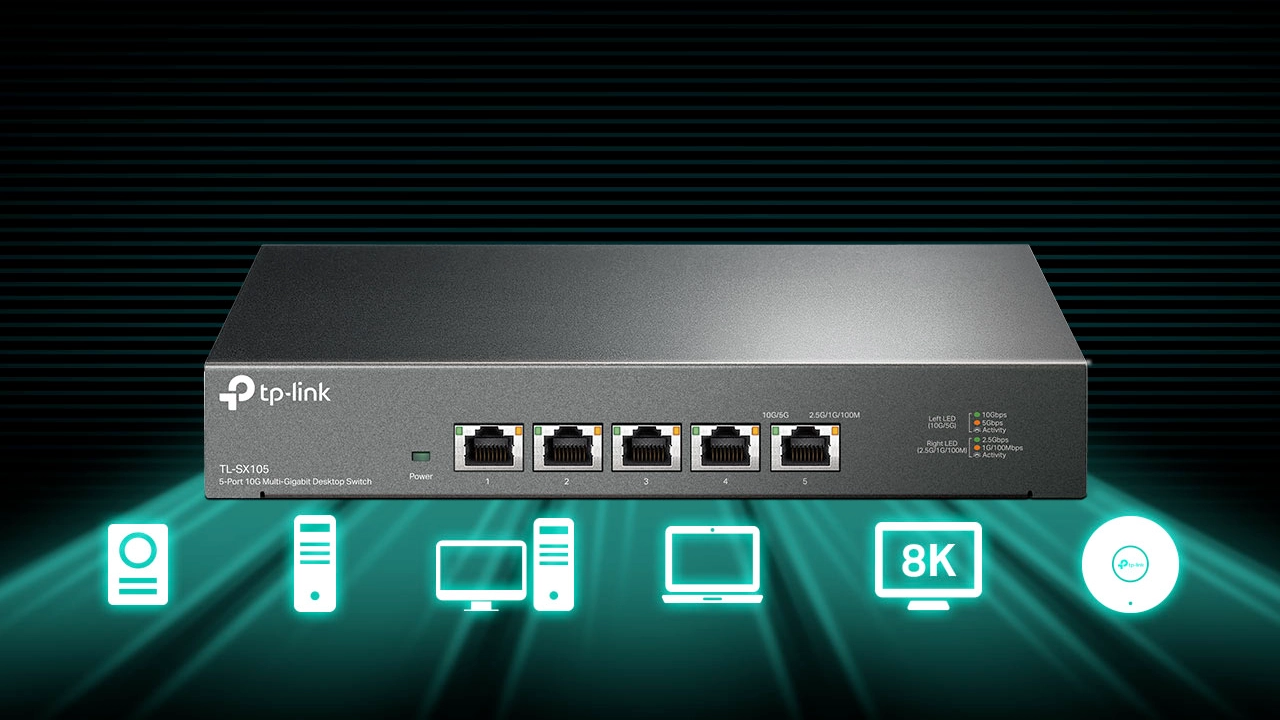 TP-Link's 5-port TL-SX105 and 8-port TL-SX1008 10GbE switches are based on unknown hardware, but they feature a 100Gbps and a 160Gbps switching capacity, so they should be good enough to connect several 10GbE devices. The switches are backward compatible with 100Mbps, GbE, 2.5GbE, and 5GbE connections, yet they have to use CAT6 or CAT6a copper cables to hit 10GbE speeds. Both units come in metal chassis. The smaller model is cooled passively, whereas the bigger unit uses a fan that adjusts its speed based on load and temperature.