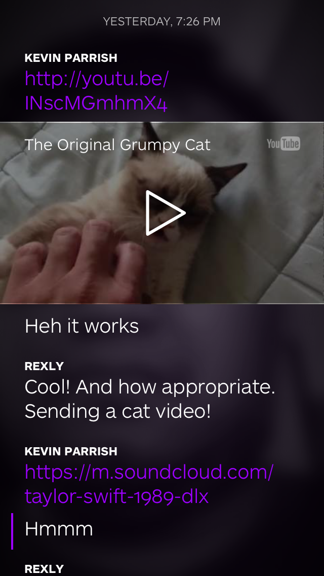 In addition to making a call, users can also send YouTube clips and SoundCloud audio clips. Unfortunately, there's really no easy way to do this. For YouTube, I opened up Safari on the iPhone, loaded up a Grumpy Cat video, copied the URL, and then pasted it within the chat window. The result was an embedded video that my contact could watch within the message body; no browser loading needed.