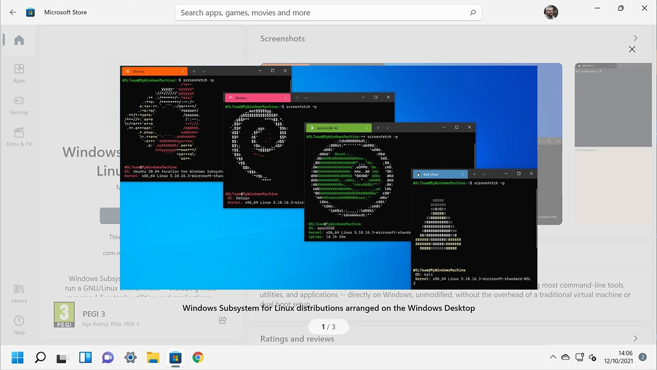 Previously, WSL had to be installed as an optional Windows component, but now it’s treated just like any other app. The version of the subsystem that’s installed is described as a ‘preview’, but its screenshots show Kali, Debian, OpenSuse and Ubuntu distributions all running at the same time, also with GUI applications.