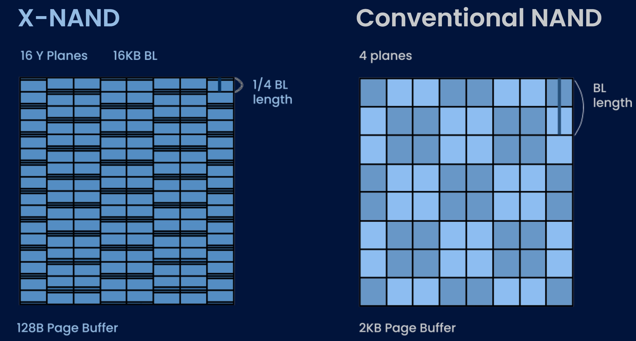 Neo Semiconductor’s X-NAND architecture can be applied to all generations of flash memory and involves dividing each plane of the 3D matrix into four to 16 sub-planes, each of which can be accessed in parallel, using page buffers to optimize speed. Gen 2 X-NAND (PDF) takes this idea and compresses it down, using one plane to write to another, whereas before, it would have used three planes to write to a fourth. See our feature here for a fuller write-up of how the technology works.