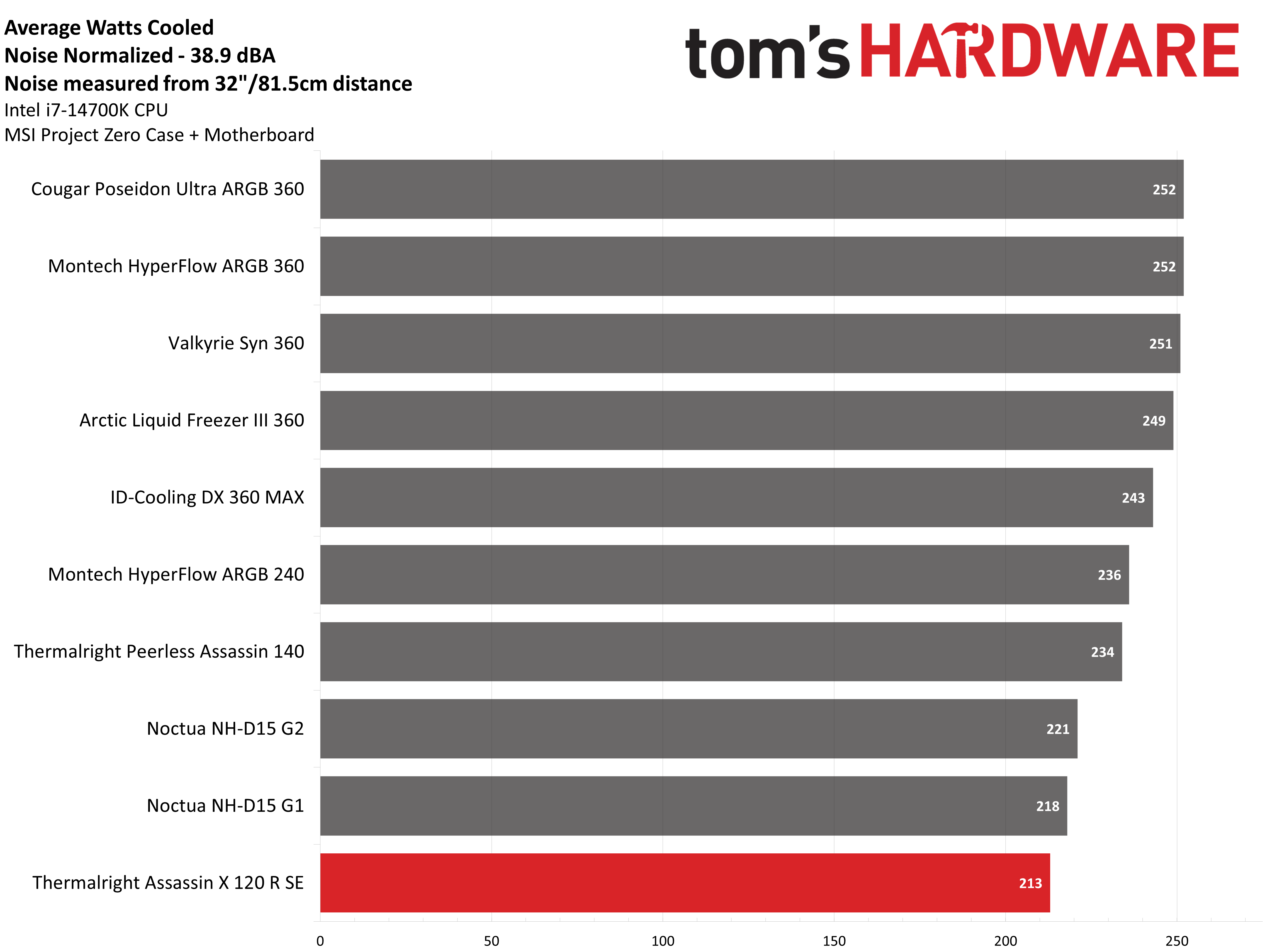 Thermalright’s Assassin X 120 R SE cooled an average of 213W in this scenario, only 5W behind Noctua’s first-generation NH-D15!