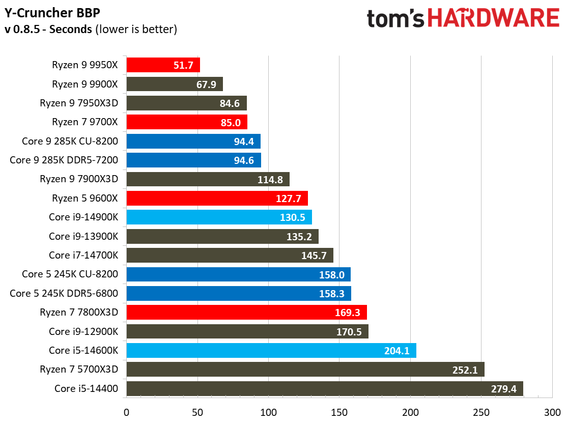 The 285K made a small advance in single-threaded performance, outpacing the 14900K by 3%. That's good enough to stay at the top of the leaderboard, and also 6% faster than the Ryzen 9 9950X.