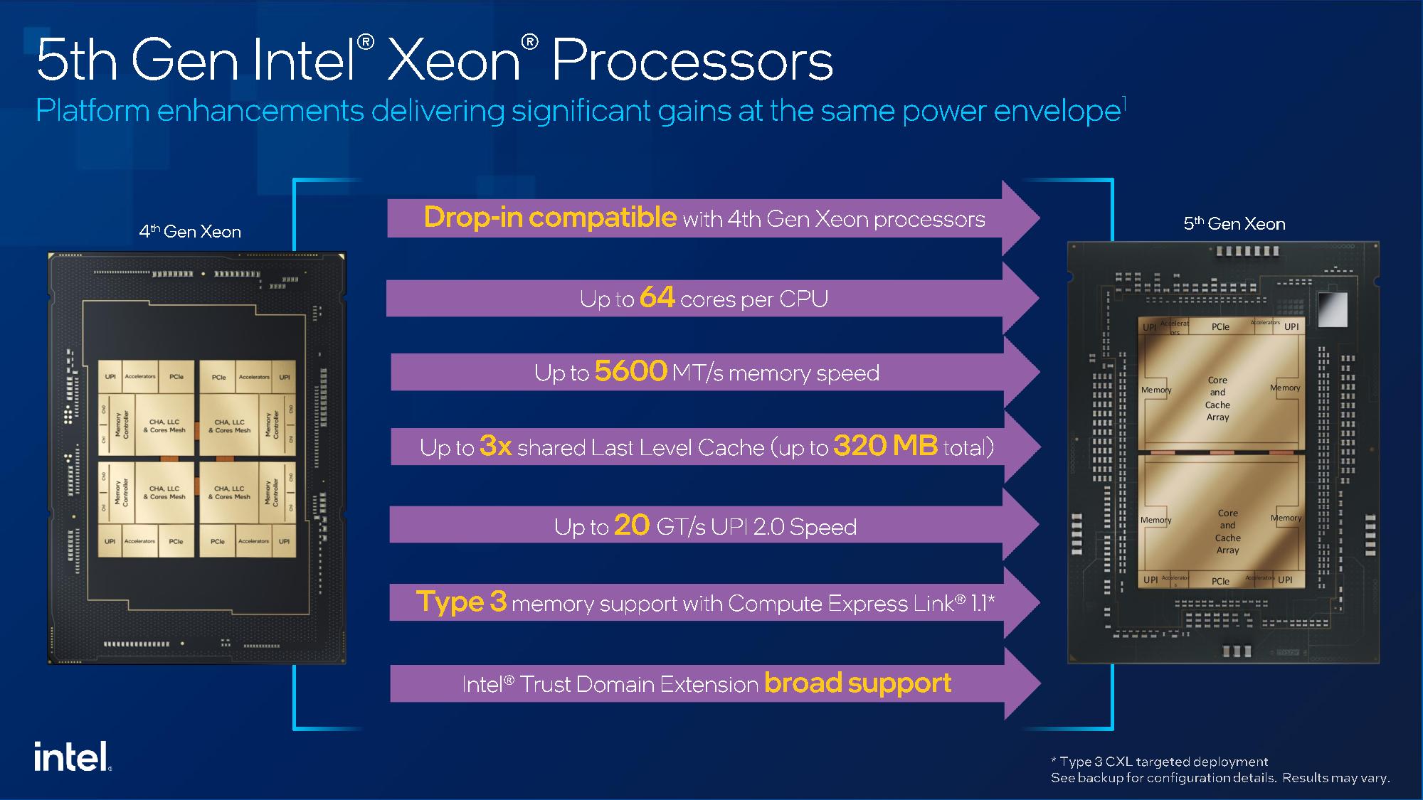 As with the previous-gen Sapphire Rapids processors, Emerald Rapids leverages the 'Intel 7' process, albeit a more refined version of the node, and the slightly-enhanced Raptor Cove microarchitecture. However, the new Emerald Rapids server chips come with plenty of new innovations and design modifications that far exceed what we've come to expect from a refresh generation — Intel moved from the complex quad-chiplet design for the top-tier Sapphire Rapids chips to a simpler two-die design that wields a total of 61 billion transistors, with the new die offering a more consistent latency profile. Despite the redesign, Emerald Rapids still maintains backward compatibility with the existing Sapphire Rapids 'Eagle Stream' platform, reducing validation time and allowing for fast market uptake of the new processors.