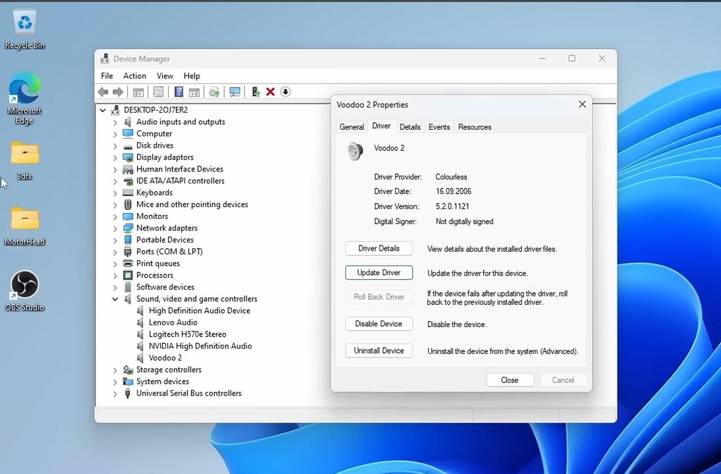 Perhaps the TechTuber was pushing his luck by trying to run two Voodoo2s in SLI on the same system, next. Indeed, using his second Voodoo2, a Joytech Apollo 3D Fast II 12MB, which isn’t a perfect glitch-free runner, caused this delicately teetering concoction of hardware to topple in Windows 11.
