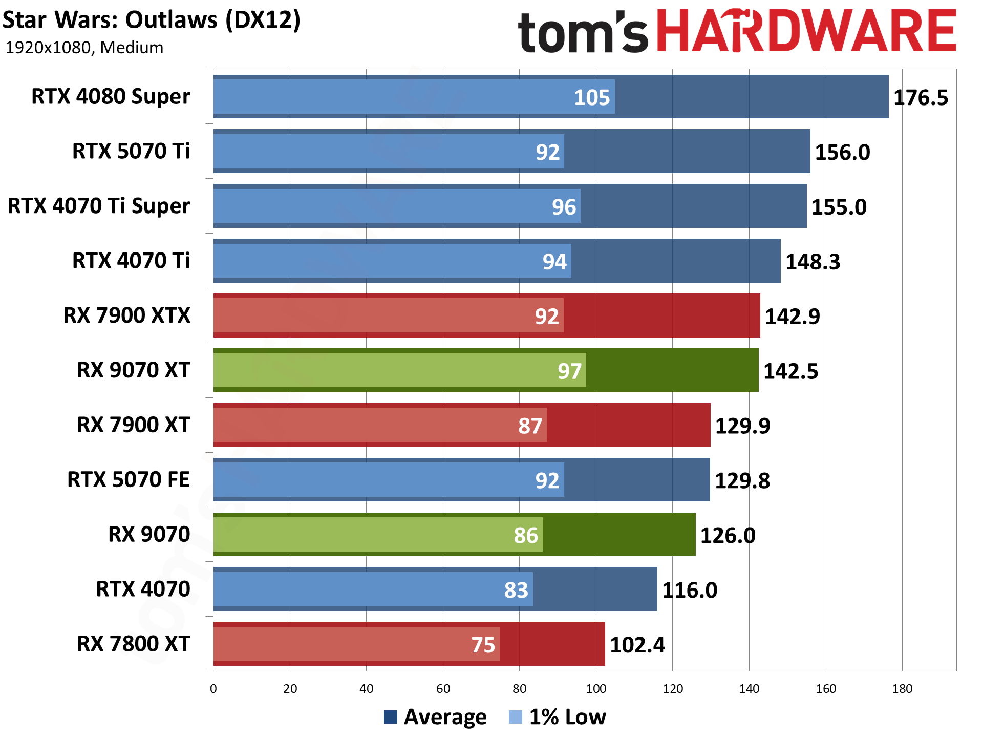 Star Wars Outlaws uses the Snowdrop engine, and we wanted to include a mix of options. It also has a bunch of RT options that we leave off four our tests. As with several other games, turning on maximum RT settings in Outlaws tends to result in a less than ideal gaming experience, with a lot of stuttering and hitching even on the fastest cards.