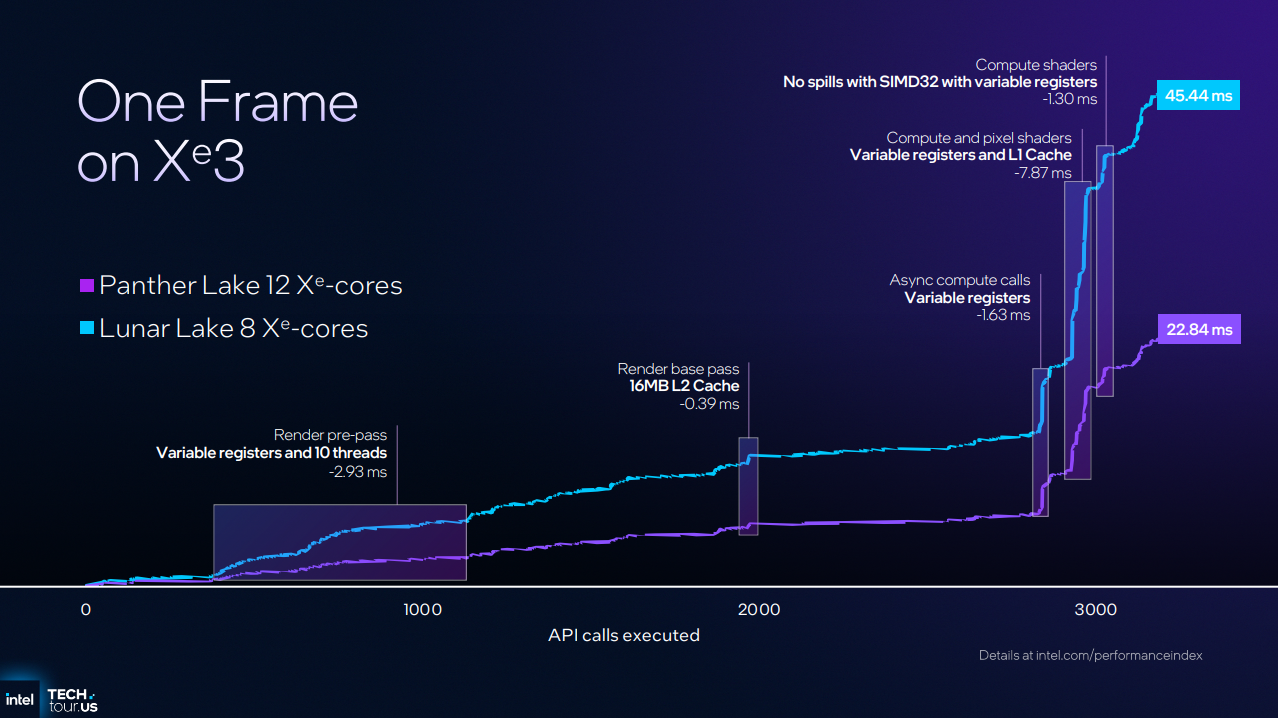 Another way Intel talks about performance with Xe3 is by walking through the time it takes for a hypothetical frame to be rendered on both Lunar Lake and Panther Lake. As any graphics performance enthusiast knows, a lower frame time on average means higher frame rates. One frame isn't terribly useful as a benchmark, but Intel's trip inside the frame time journey shows several key improvements related to the microarchitectural refinements in Xe3. Overall, this same frame renders in 22.84 ms on the 12 Xe3-Core GPU, or 50% less time.