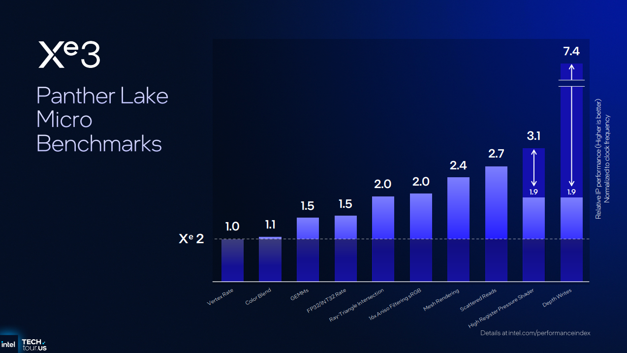 In a range of proprietary microarchitectural benchmarks versus the Xe2 GPU on Lunar Lake, you can see that the performance of the 12 Xe3 Core GPU in some operations hasn't changed between Xe2 and Xe3, simply because the available resources per render slice haven't grown. Intel demonstrates that some other operations have scaled linearly with the 50% increase in Xe Cores from Lunar Lake to Panther Lake's 12 Xe configuration.