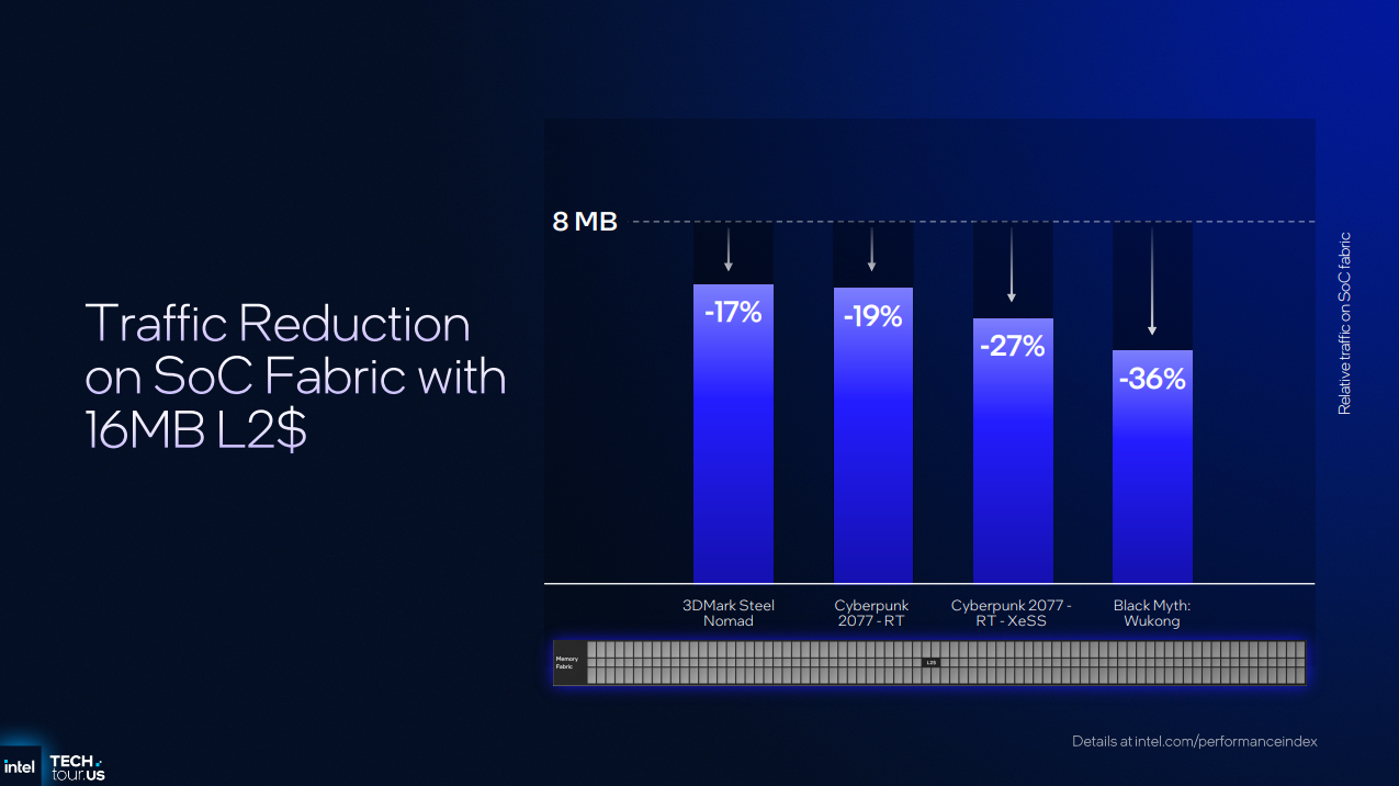 Intel says a larger L2 cache reduces traffic on Panther Lake's on-package fabric that connects the graphics processor to main memory - an important consideration for an integrated graphics processor that might be contending with a CPU and NPU for access to RAM. Intel showed a chart claiming anywhere from a 17% to 36% reduction in fabric traffic compared to a product with an 8MB L2 as a baseline.